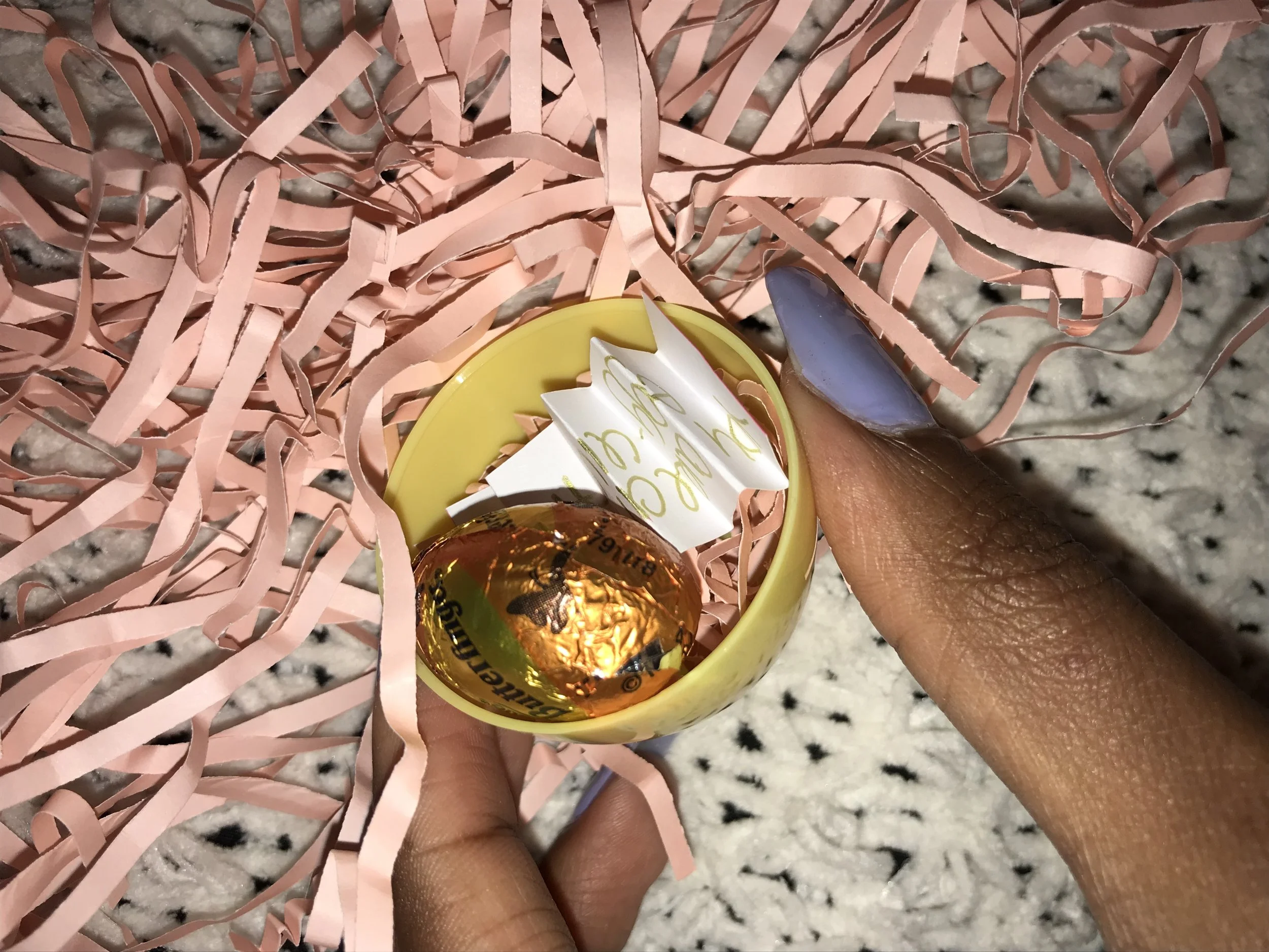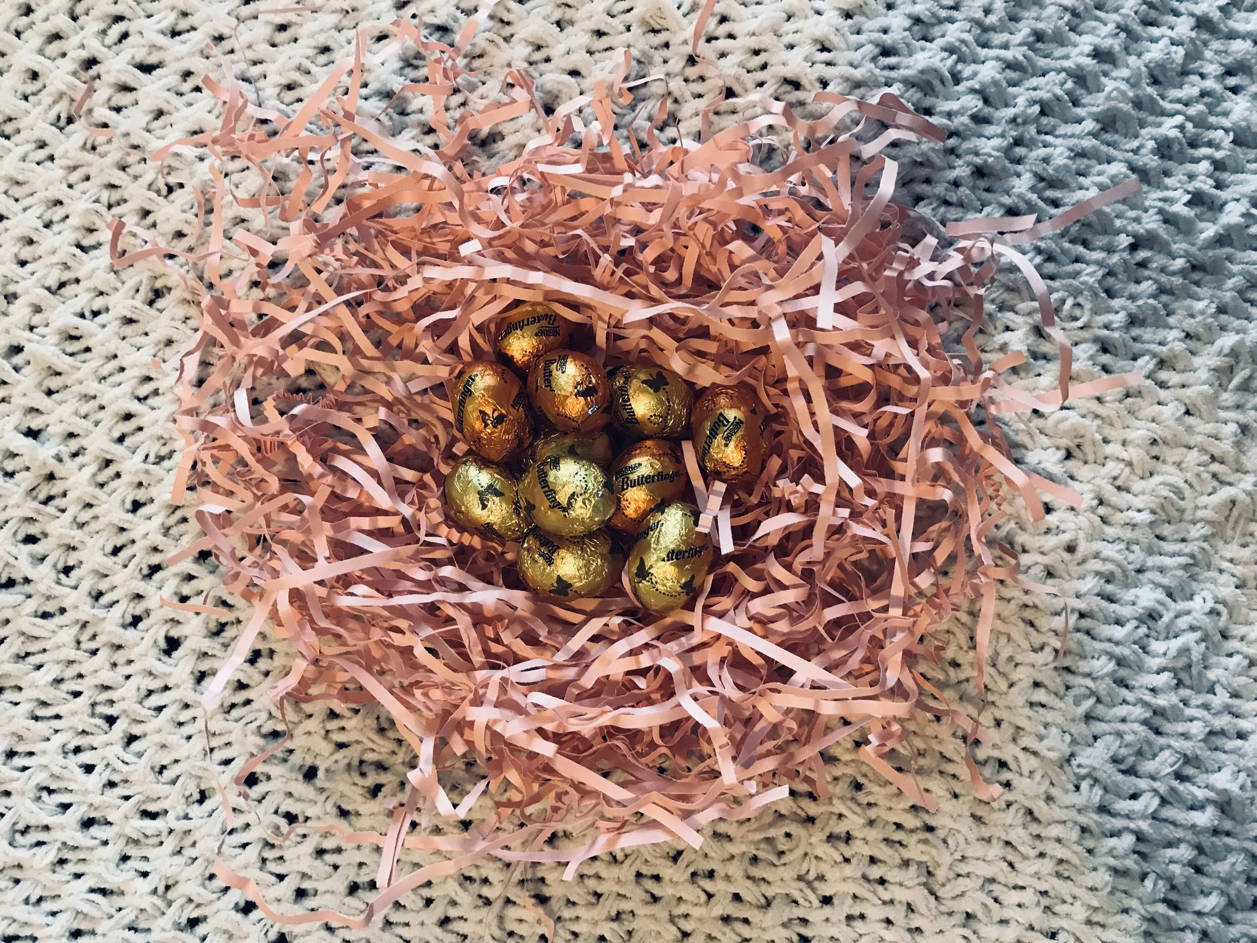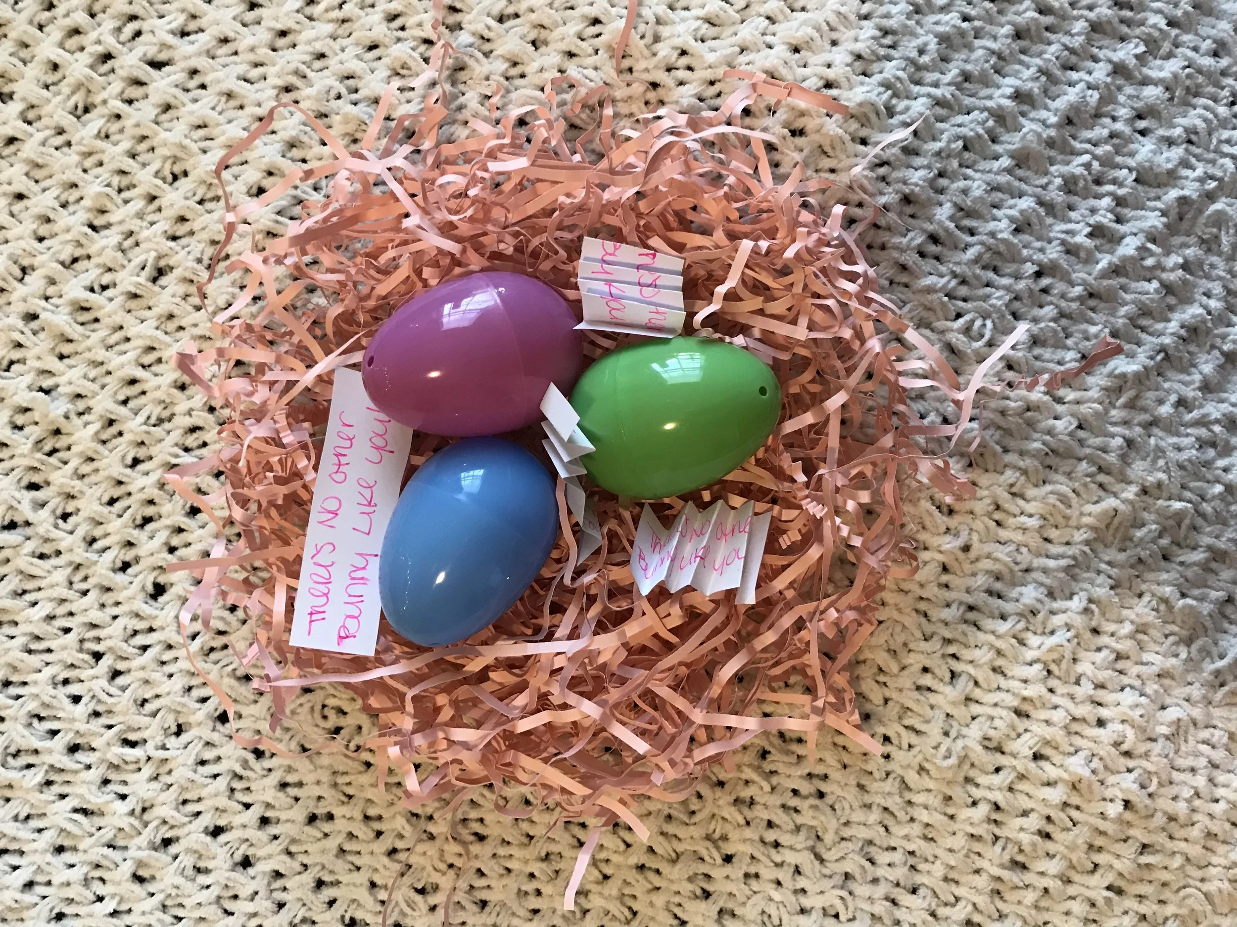 You want to make your tiny notes first. I wanted something simple and something that would put a smile on everyone’s face. So I googled Easter Puns. A few of the ones I chose were, “There is no bunny like you,” “Let Hoppy thoughts multiply like rabbits,” and “You’re the best Jelly Bean to pick.” Once I picked the ones I liked, I grabbed some sheets of paper and cut them down into little rectangular slips. Wrote a note on each one and crinkled the note up to mimic the Pink Crinkle Shredded Paper.